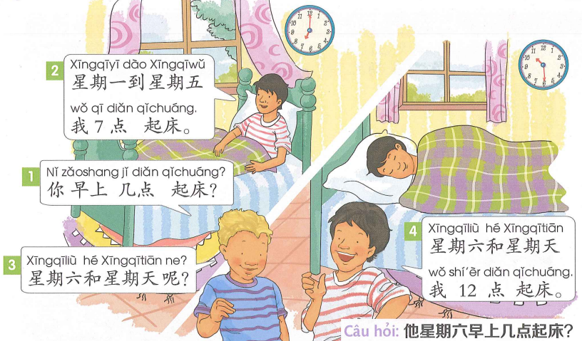 Thói quen sinh hoạt hằng ngày như thức dậy, đi ngủ đúng giờ là điều rất quan trọng đối với các bạn nhỏ. Trong bài học số 2 của giáo trình YCT2, chúng ta sẽ cùng học cách nói về thời gian thức dậy, đi ngủ và các hoạt động thường ngày bằng tiếng Trung. Bài học không chỉ giúp học sinh mở rộng vốn từ vựng mà còn rèn luyện khả năng hỏi – đáp đơn giản và sử dụng các mẫu câu quen thuộc trong cuộc sống hàng ngày.